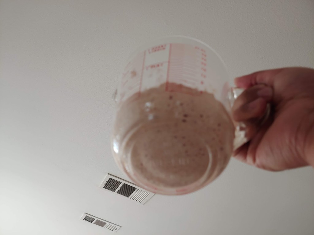 The Next morning a float test was preformed on one tablespoon of leaven in a glass full of water. The float test shows that the homemade yeast is working by trapping gas and at this point the dough becomes lighter than the water itself. it indicates the culture mix is close to the baking portion.